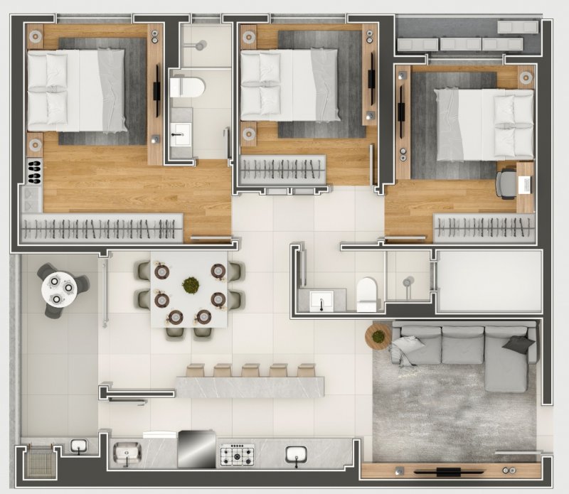 Apartamentos com opções de 1 Suíte + 2 dormitórios OU 1 Suíte + 1 Dormitório, contam com: